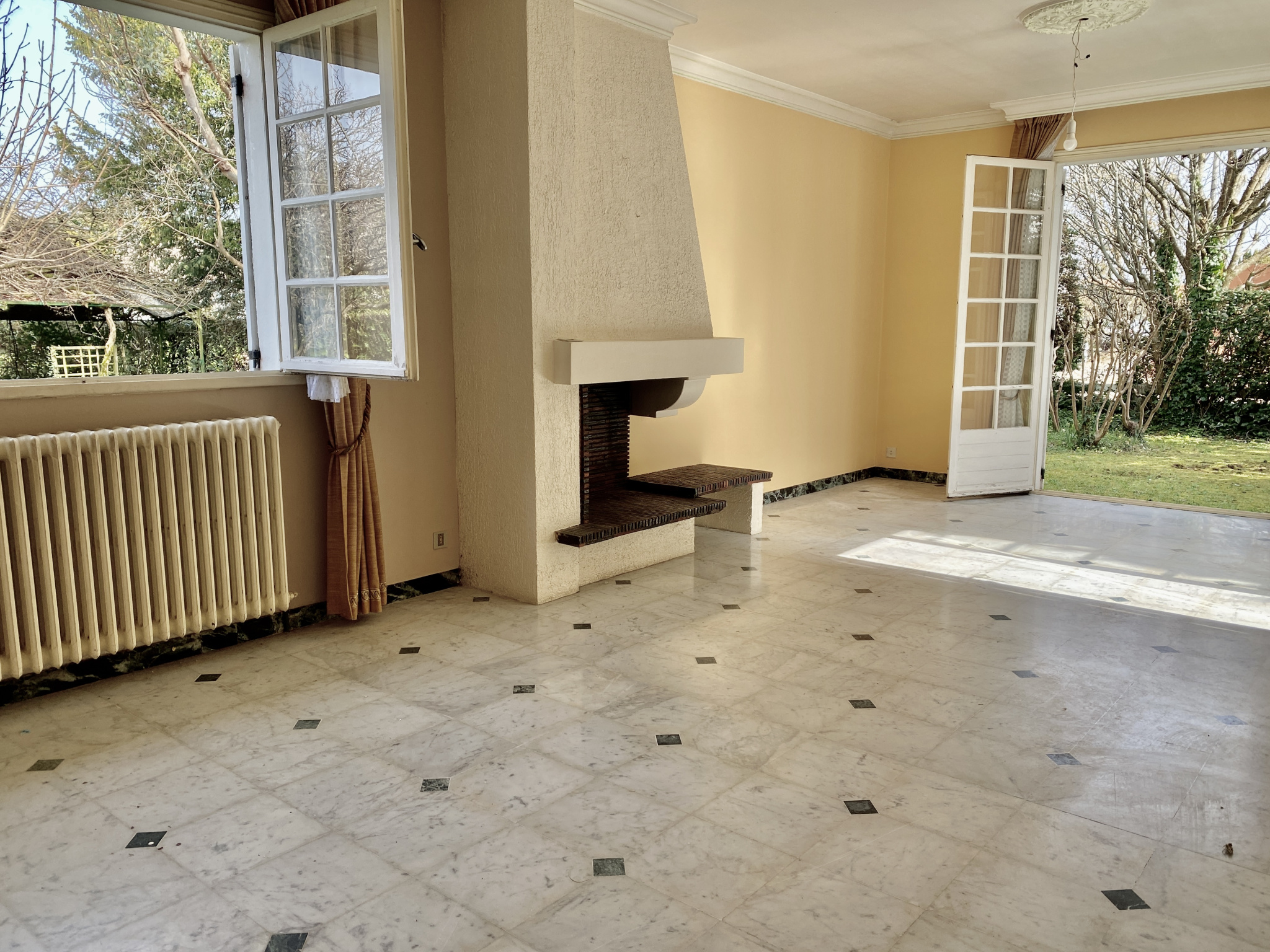 Elle comprend une entrée, un dressing, un séjour avec une cheminée (sol en marbre), une cuisine séparée, une véranda donnant sur la cuisine, quatre chambres, une salle de bain, un WC. Ce bien est complété par un grand garage, une chaufferie, un cellier, un local jardin et une cave. Le tout sur une parcelle arborée 1139m2. Elle doit être remise à votre goût. Vous serez séduit à la fois par le calme et l'emplacement pour faire vos courses à pied. Ce bien est proposé par Madame Sophie Lopez-Passe 06 03 19 77 07 N°SIRET 41995988700045