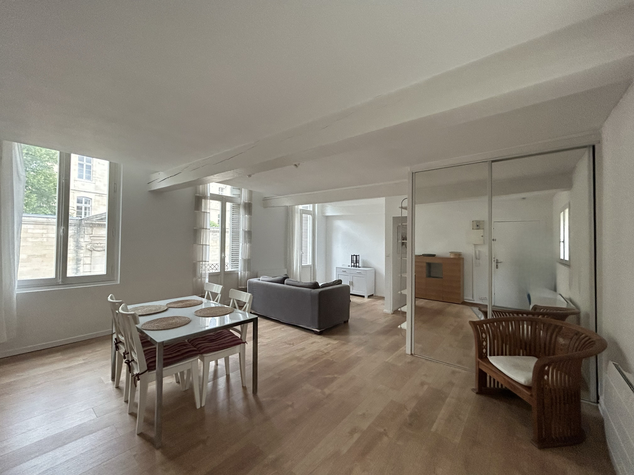 PEY-BERLAND / MUSÉE D'AQUITAINE - T3 Meublé Votre agence ABEC IMMOBILIER vous propose en plein coeur de Bordeaux, dans une rue calme et piétonne, au 1er étage d'un immeuble en pierre, un appartement de type 3 meublé CALME et LUMINEUX. Il se compose d'une grande pièce de vie de 34m² avec rangement donnant sur deux balcons filants, une cuisine individuelle aménagée et équipée (lave vaisselle, four, plaques de cuissons, hotte aspirante, rangements, réfrigérateur, et lave linge) de deux chambres de 10 et 13m² avec placards intégrés, une salle de bain et WC séparés. Double vitrage, chauffage éléctrique. DISPONIBLE